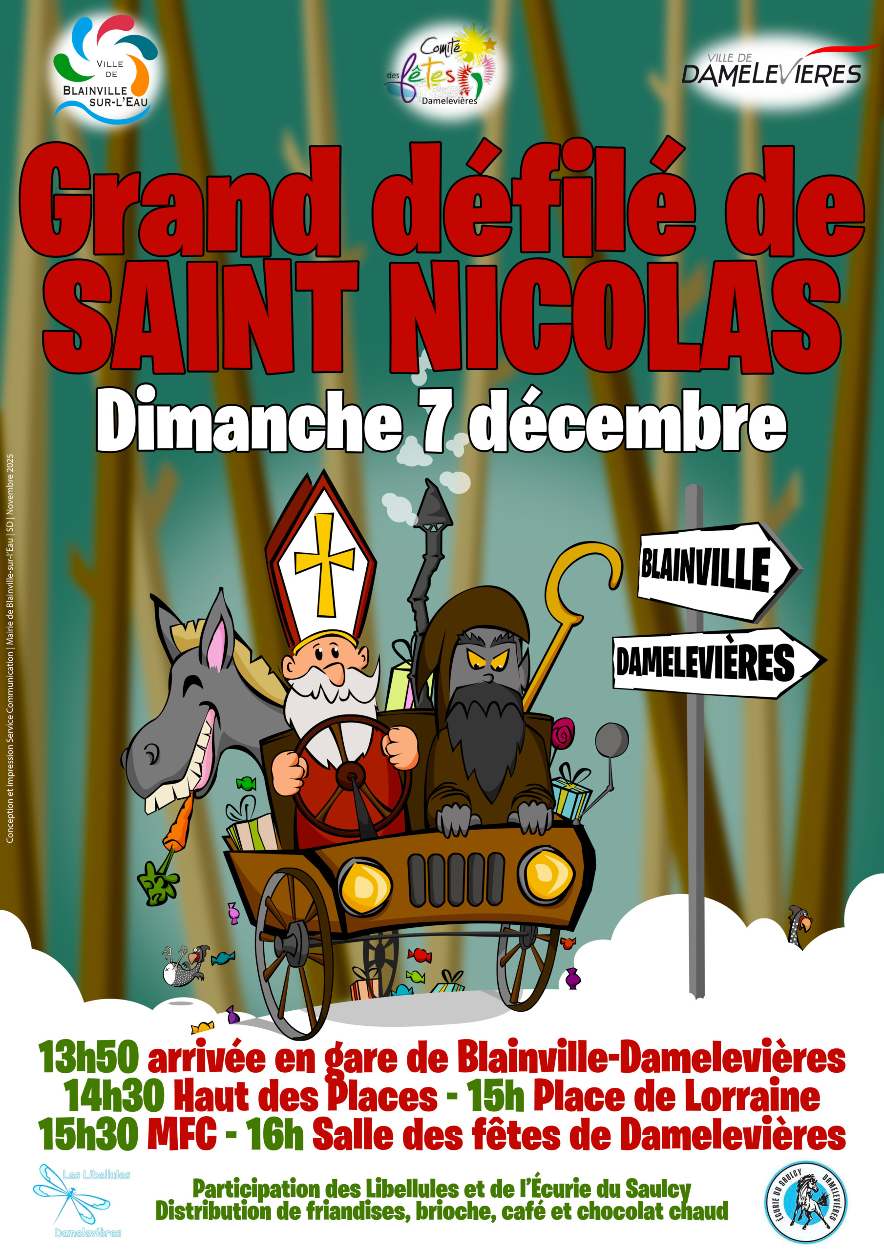 Grand défilé de Saint Nicolas le dimanche 7 décembre entre Blainville-sur-l'Eau et Damelevières 13h50 arrivée en gare de Blainville - Damelevières. 14h30 Haut des Places. 15h Place de Lorraine. 15h30 MFC. 16h