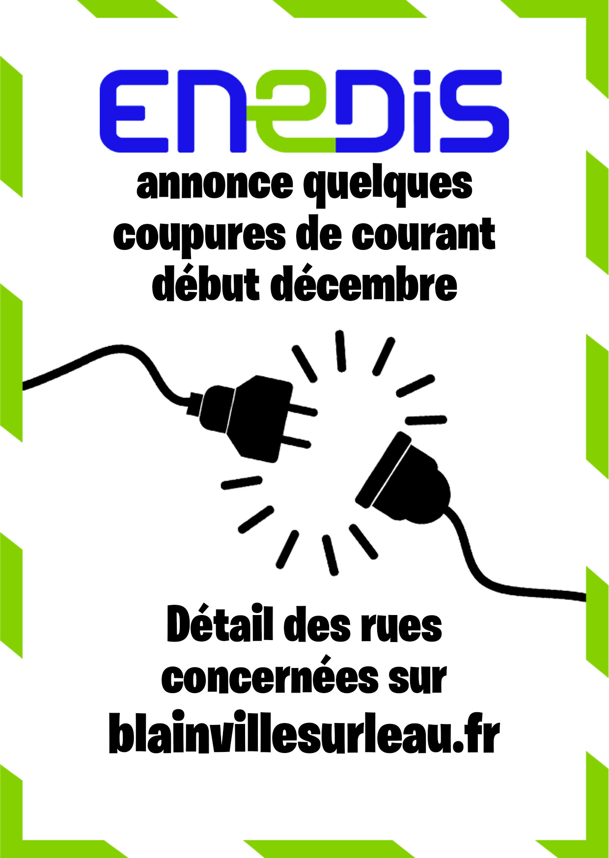 ENEDIS nous informe de possibles coupures de courant : ATTENTION LES COUPURES PRÉVUES LE 1ER DÉCEMBRE SONT REPORTÉES AU 8 DÉCEMBRE lundi 8 décembre 2025 de 07h45 à 11h45 Quartiers ou lieux-dits: