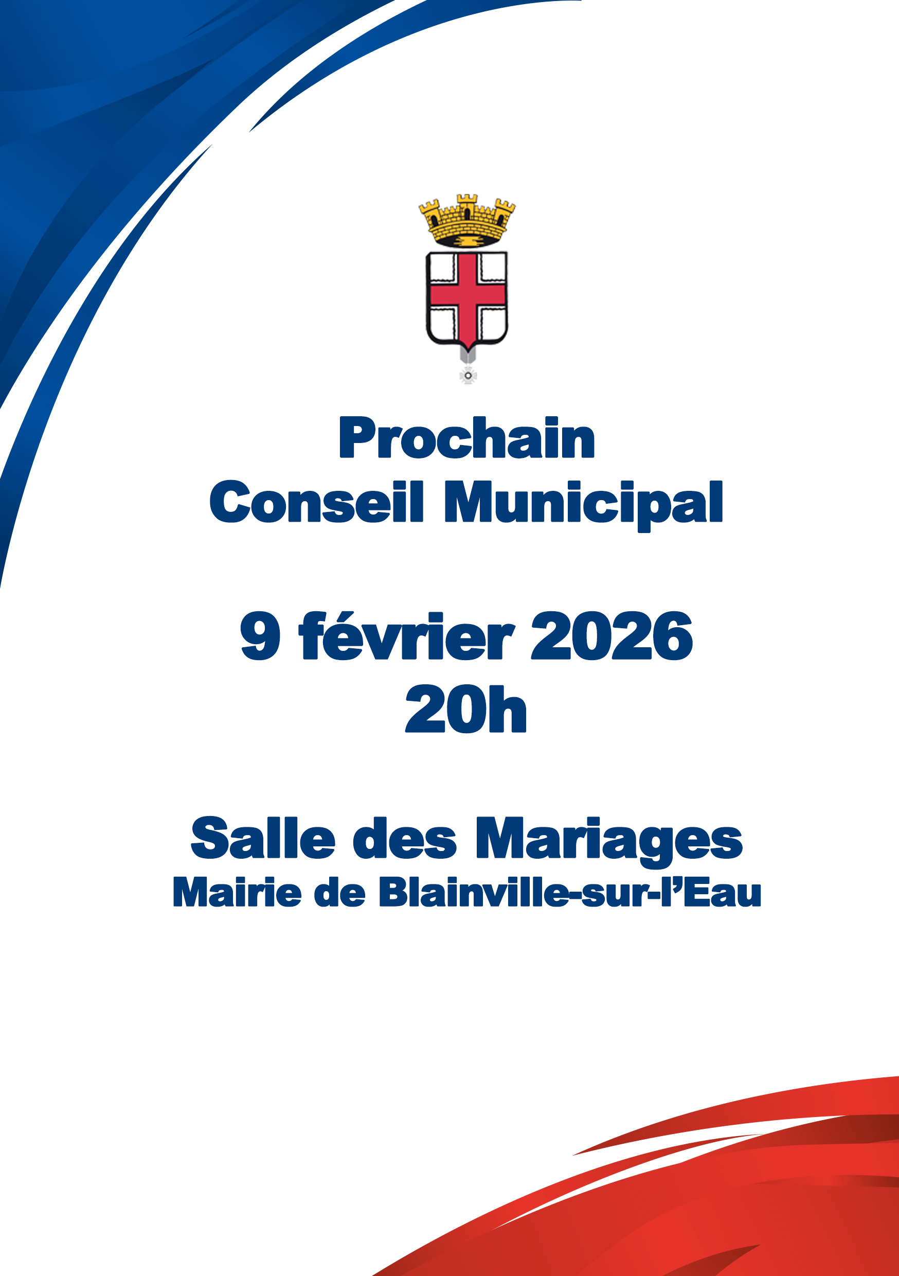 Le prochain Conseil Municipal se tiendra le 9 février 2026, Salle des Mariages de la Mairie de Blainville-sur-l'Eau.