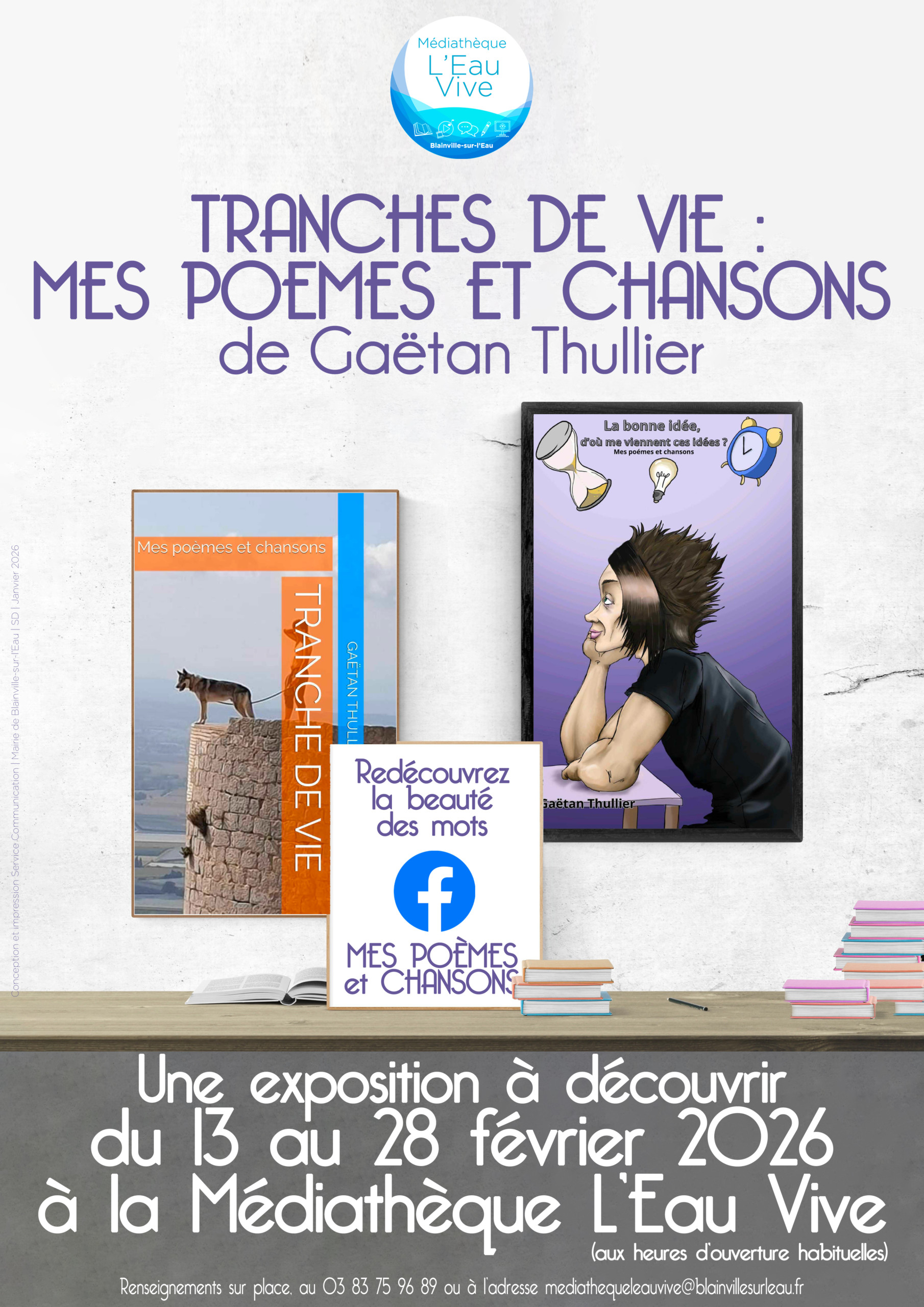 Gaëtan Thullier s'expose à la Médiathèque L'Eau Vive du 13 au 28 février 2026. Tranches de vie : mes poèmes et chansons est une rétrospective de l'oeuvre du poète par le biais